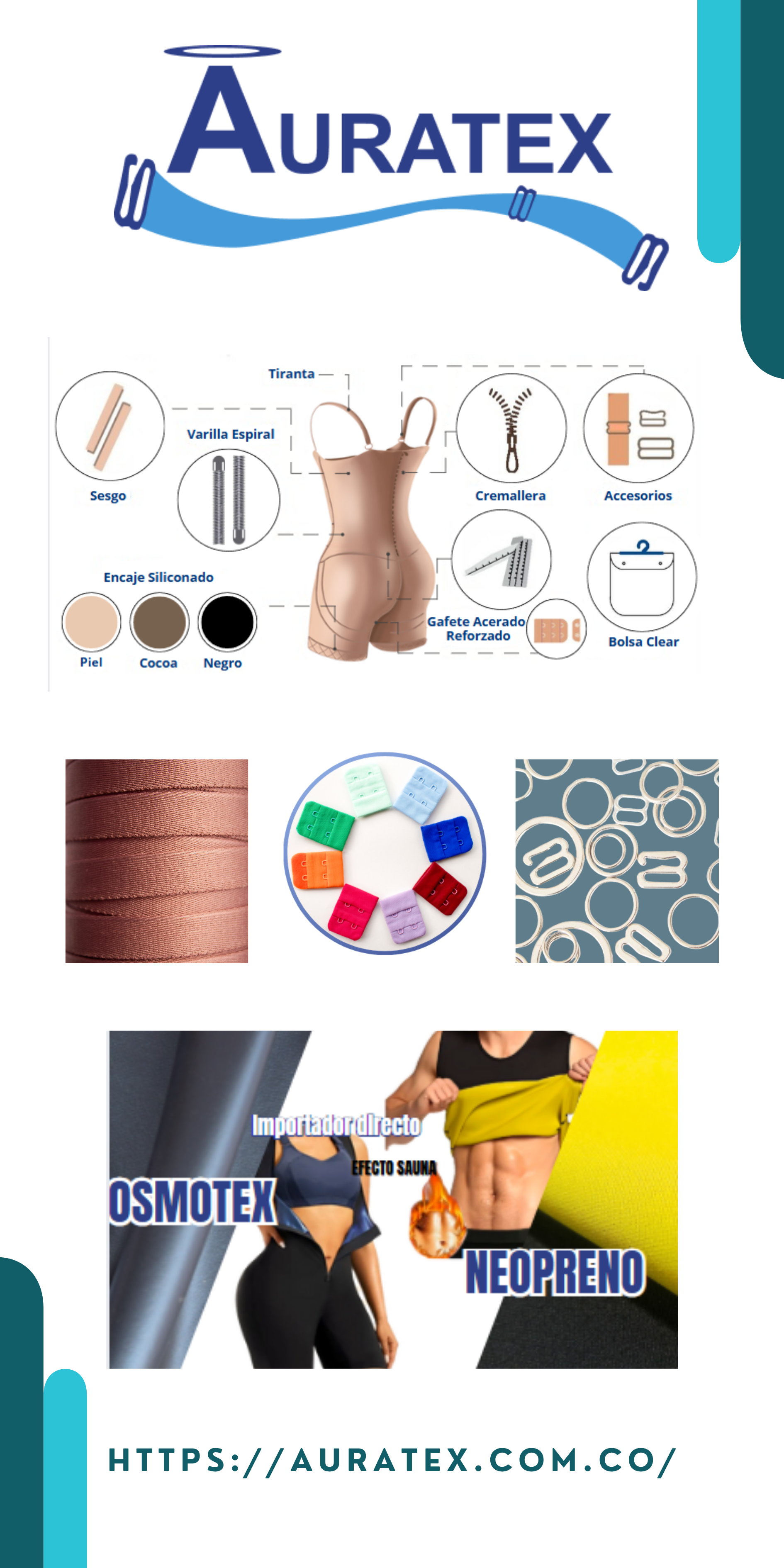 Auratex SAS es una empresa sólida en venta de insumos para corsetería y fajas, nuestros principales productos son encajes, gafetes, accesorios metálicos, tirantas y telas. Contamos con 20 años de experiencia en el mercado en los cuales hemos resaltados por nuestros productos de calidad.